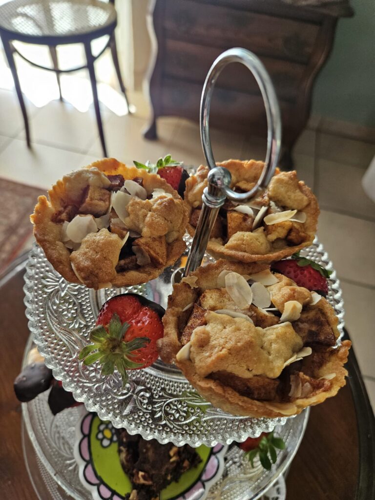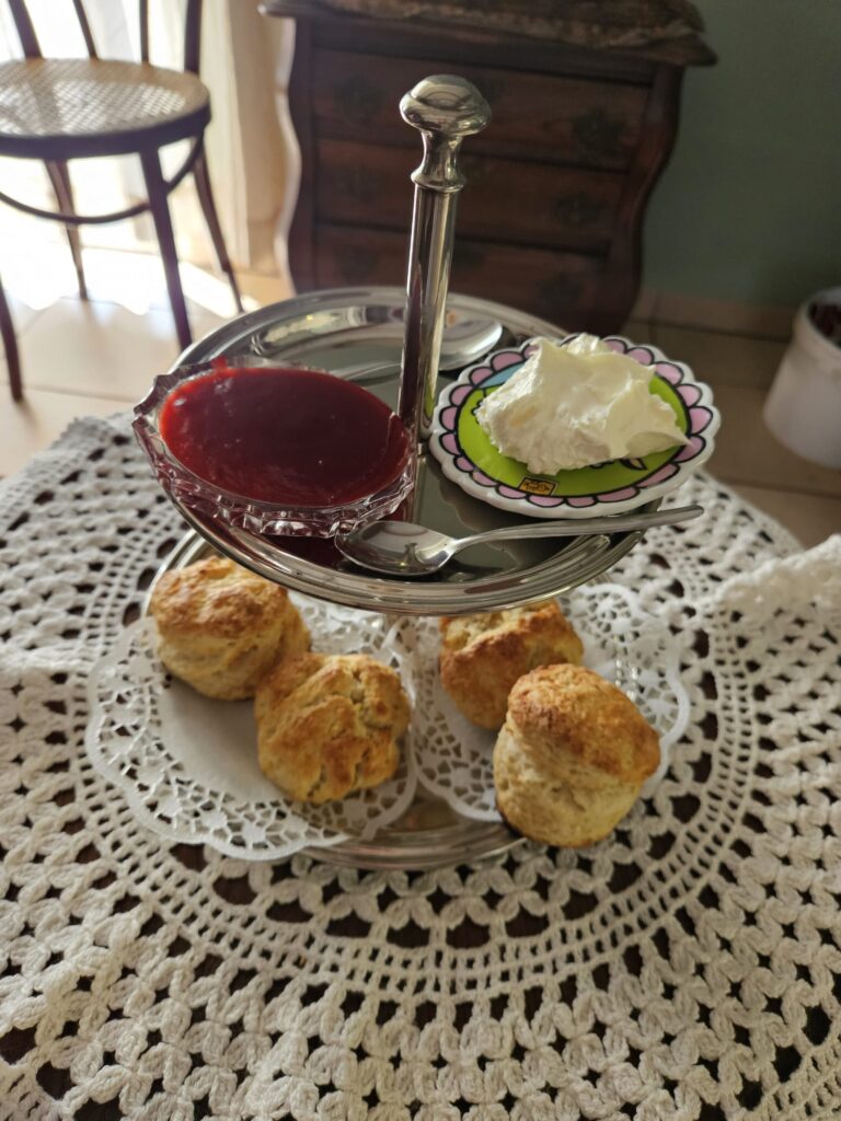 We sluiten af met een heerlijke goedgevulde zoete toren, met natuurlijk scones met echte clotted cream en zelfgemaakte jam. Ook krijg je een heerlijke brownie, een mini appeltaartje en een andere lekkere zoete lekkernij.