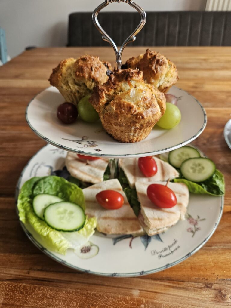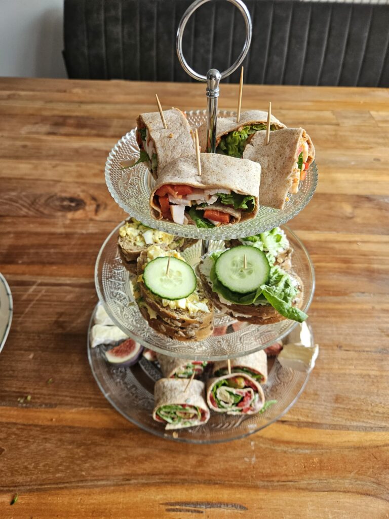 De high tea bestaat uit een huisgemaakt seizoensgebonden soepje vooraf. Gevolgd door een hartige toren, bestaande uit een hartige muffin, een heerlijk pita broodje met verse Parma ham en diverse belegde broodjes met o.a. huisgemaakte eiersalade, roomkaas en twee soorten wraps.